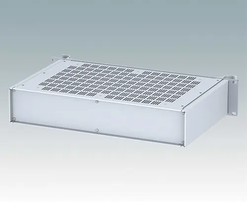 Universelles 19" Rack-Gehäuse mit eloxierten Alufrontblechen und zwei ergonomischen Frontblechgriffen. Der Alugehäusekörper besteht aus zwei Seitenblechen mit abnehmbaren Deck-, Boden- und Rückblechen. Das Bodenblech hat Montagelöcher für eine Leiterplatte oder die zugehörige Montageplatte. Für den elektrischen Anschluss sind alle Teile mit M4 Erdungsschrauben ausgestattet.