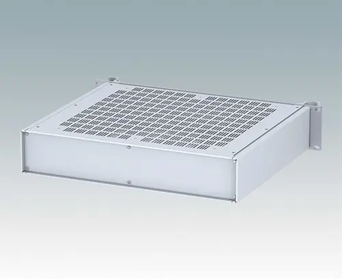 Universelles 19" Rack-Gehäuse mit eloxierten Alufrontblechen und zwei ergonomischen Frontblechgriffen. Der Alugehäusekörper besteht aus zwei Seitenblechen mit abnehmbaren Deck-, Boden- und Rückblechen. Das Bodenblech hat Montagelöcher für eine Leiterplatte oder die zugehörige Montageplatte. Für den elektrischen Anschluss sind alle Teile mit M4 Erdungsschrauben ausgestattet.