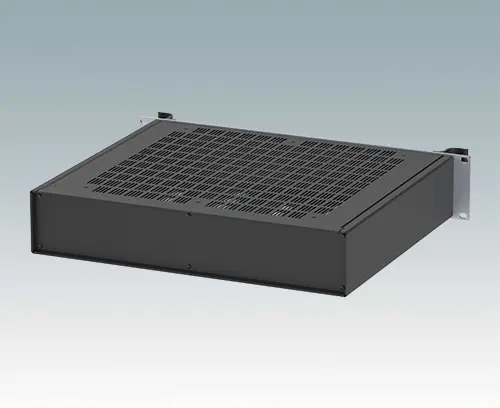 Universelles 19" Rack-Gehäuse mit eloxierten Alufrontblechen und zwei ergonomischen Frontblechgriffen. Der Alugehäusekörper besteht aus zwei Seitenblechen mit abnehmbaren Deck-, Boden- und Rückblechen. Das Bodenblech hat Montagelöcher für eine Leiterplatte oder die zugehörige Montageplatte. Für den elektrischen Anschluss sind alle Teile mit M4 Erdungsschrauben ausgestattet.