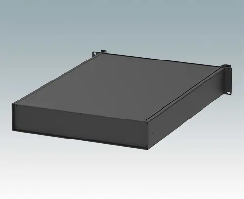 Universelles 19" Rack-Gehäuse mit Frontplatte in Aluminium schwarz lackiert und zwei ergonomischen Frontblechgriffen. Der Alugehäusekörper besteht aus zwei Seitenblechen mit abnehmbaren Deck-, Boden- und Rückblechen. Das Bodenblech hat Montagelöcher für eine Leiterplatte oder die zugehörige Montageplatte. Für den elektrischen Anschluss sind alle Teile mit M4 Erdungsschrauben ausgestattet.