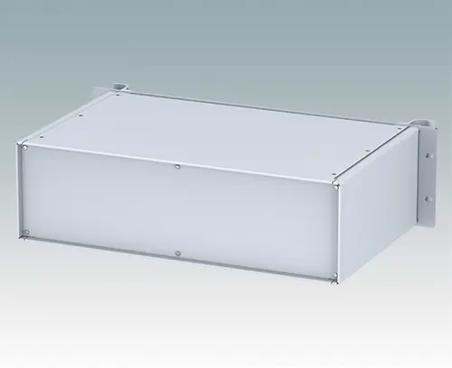 Universelles 19" Rack-Gehäuse mit eloxierten Alufrontblechen und zwei ergonomischen Frontblechgriffen. Der Alugehäusekörper besteht aus zwei Seitenblechen mit abnehmbaren Deck-, Boden- und Rückblechen. Das Bodenblech hat Montagelöcher für eine Leiterplatte oder die zugehörige Montageplatte. Für den elektrischen Anschluss sind alle Teile mit M4 Erdungsschrauben ausgestattet.
