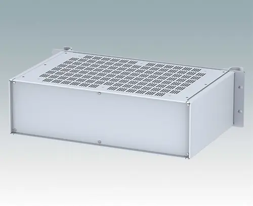 Universelles 19" Rack-Gehäuse mit eloxierten Alufrontblechen und zwei ergonomischen Frontblechgriffen. Der Alugehäusekörper besteht aus zwei Seitenblechen mit abnehmbaren Deck-, Boden- und Rückblechen. Das Bodenblech hat Montagelöcher für eine Leiterplatte oder die zugehörige Montageplatte. Für den elektrischen Anschluss sind alle Teile mit M4 Erdungsschrauben ausgestattet.