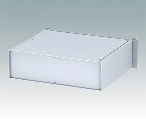Universelles 19" Rack-Gehäuse mit eloxierten Alufrontblechen und zwei ergonomischen Frontblechgriffen. Der Alugehäusekörper besteht aus zwei Seitenblechen mit abnehmbaren Deck-, Boden- und Rückblechen. Das Bodenblech hat Montagelöcher für eine Leiterplatte oder die zugehörige Montageplatte. Für den elektrischen Anschluss sind alle Teile mit M4 Erdungsschrauben ausgestattet.