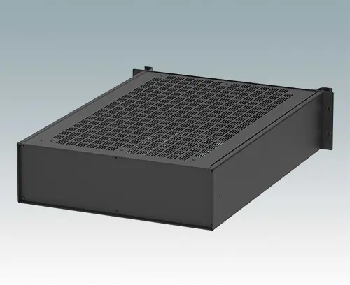 Universelles 19” Rack-Gehäuse mit Frontplatte in Aluminium schwarz lackiert und zwei ergonomischen Frontblechgriffen. Der Alugehäusekörper besteht aus zwei Seitenblechen mit abnehmbaren Deck-, Boden- und Rückblechen. Das Bodenblech hat Montagelöcher für eine Leiterplatte oder die zugehörige Montageplatte. Für den elektrischen Anschluss sind alle Teile mit M4 Erdungsschrauben ausgestattet.