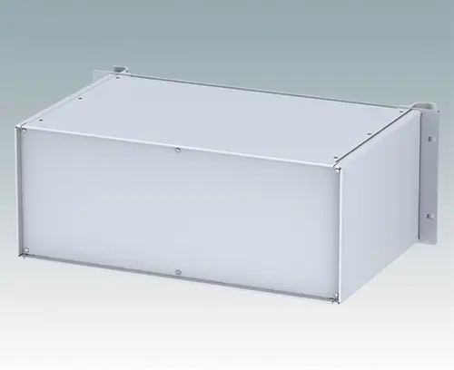 Universelles 19-Zoll-Rack-Gehäuse mit eloxierten Alufrontblechen und zwei ergonomischen Frontblechgriffen. Der Alugehäusekörper besteht aus zwei Seitenblechen mit abnehmbaren Deck-, Boden- und Rückblechen. Das Bodenblech hat Montagelöcher für eine Leiterplatte oder die zugehörige Montageplatte. Für den elektrischen Anschluss sind alle Teile mit M4 Erdungsschrauben ausgestattet.