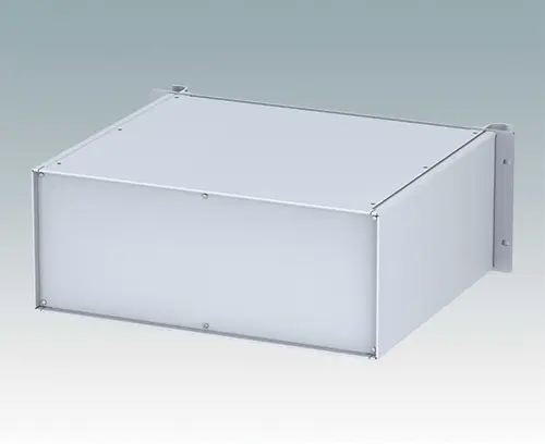 Universelles 19-Zoll-Rack-Gehäuse mit eloxierten Alufrontblechen und zwei ergonomischen Frontblechgriffen. Der Alugehäusekörper besteht aus zwei Seitenblechen mit abnehmbaren Deck-, Boden- und Rückblechen. Das Bodenblech hat Montagelöcher für eine Leiterplatte oder die zugehörige Montageplatte. Für den elektrischen Anschluss sind alle Teile mit M4 Erdungsschrauben ausgestattet.