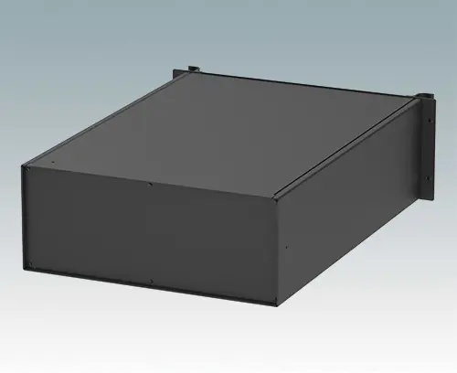 Universelles 19” Rack-Gehäuse mit Frontplatte in Aluminium schwarz lackiert und zwei ergonomischen Frontblechgriffen. Der Alugehäusekörper besteht aus zwei Seitenblechen mit abnehmbaren Deck-, Boden- und Rückblechen. Das Bodenblech hat Montagelöcher für eine Leiterplatte oder die zugehörige Montageplatte. Für den elektrischen Anschluss sind alle Teile mit M4 Erdungsschrauben ausgestattet.