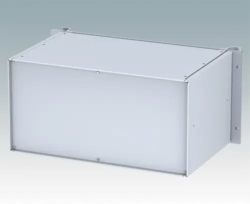 Universelles 19-Zoll-Rack-Gehäuse mit eloxierten Alufrontblechen und zwei ergonomischen Frontblechgriffen. Der Alugehäusekörper besteht aus zwei Seitenblechen mit abnehmbaren Deck-, Boden- und Rückblechen. Das Bodenblech hat Montagelöcher für eine Leiterplatte oder die zugehörige Montageplatte. Für den elektrischen Anschluss sind alle Teile mit M4 Erdungsschrauben ausgestattet.
