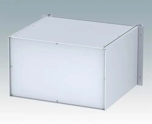 Universelles 19-Zoll-Rack-Gehäuse mit eloxierten Alufrontblechen und zwei ergonomischen Frontblechgriffen. Der Alugehäusekörper besteht aus zwei Seitenblechen mit abnehmbaren Deck-, Boden- und Rückblechen. Das Bodenblech hat Montagelöcher für eine Leiterplatte oder die zugehörige Montageplatte. Für den elektrischen Anschluss sind alle Teile mit M4 Erdungsschrauben ausgestattet.