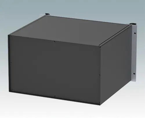 Universelles 19-Zoll-Rack-Gehäuse mit eloxierten Alufrontblechen und zwei ergonomischen Frontblechgriffen. Der Alugehäusekörper besteht aus zwei Seitenblechen mit abnehmbaren Deck-, Boden- und Rückblechen. Das Bodenblech hat Montagelöcher für eine Leiterplatte oder die zugehörige Montageplatte. Für den elektrischen Anschluss sind alle Teile mit M4 Erdungsschrauben ausgestattet.