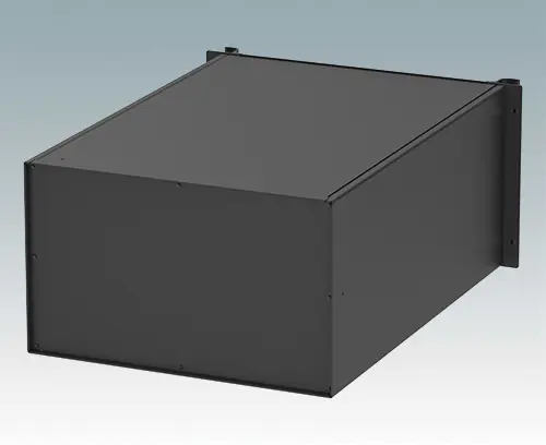 Universelles 19” Rack-Gehäuse mit Frontplatte in Aluminium schwarz lackiert und zwei ergonomischen Frontblechgriffen. Der Alugehäusekörper besteht aus zwei Seitenblechen mit abnehmbaren Deck-, Boden- und Rückblechen. Das Bodenblech hat Montagelöcher für eine Leiterplatte oder die zugehörige Montageplatte. Für den elektrischen Anschluss sind alle Teile mit M4 Erdungsschrauben ausgestattet.