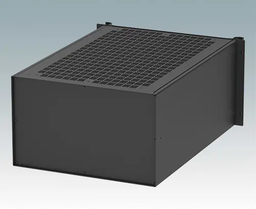 Universelles 19” Rack-Gehäuse mit Frontplatte in Aluminium schwarz lackiert und zwei ergonomischen Frontblechgriffen. Der Alugehäusekörper besteht aus zwei Seitenblechen mit abnehmbaren Deck-, Boden- und Rückblechen. Das Bodenblech hat Montagelöcher für eine Leiterplatte oder die zugehörige Montageplatte. Für den elektrischen Anschluss sind alle Teile mit M4 Erdungsschrauben ausgestattet.