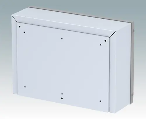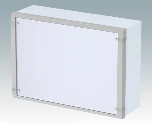 Moderne Aluminium-Gehäuse für Innenanwendungen. Elektronik während der Wandinstallation frei zugänglich. Elegantes Design mit Zink-Druckguss Frontrahmen, Haube und Rückplatte in L-Form. Front- und Montageplatten als Zubehör.