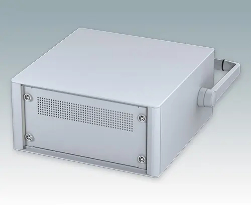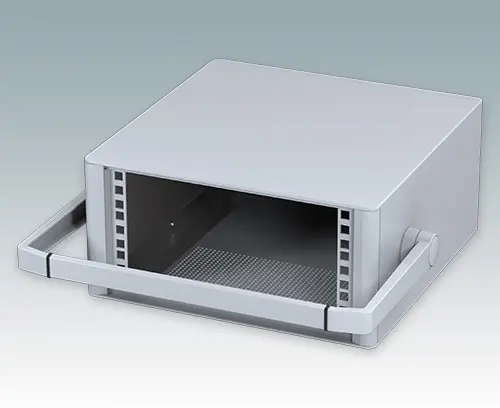 Modernes und äußerst attraktives 10.5-Zoll-Instrumentengehäuse geschaffen zur Aufnahme von Standard-3HE-Baugruppenträgern (42TE), Chassis und Frontplatten. Entsprechen DIN 41494 & IEC 297. Die eleganten Front- und Rückrahmen sind perfekt auf den Aluminiumgehäusekorpus abgestimmt. Design-Blenden (Front und Rückseite) verbergen die Montageschrauben für eine professionelle Aufmachung. Alle Gehäuseplatten sind mit M4-Gewindebolzen zum Erdanschluss ausgestattet. Das Gehäuse verfügt über eine Rückplatte, Griffbügel und vier ABS-Füße mit einsteckbare rutschfeste Gummifüße. Boden- und Rückplatte verfügen über Lüftungsschlitze. Interne Tragschienen für Baugruppenträger/Chassis.