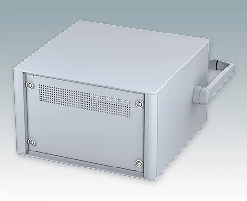 Modernes und äußerst attraktives 10.5-Zoll-Instrumentengehäuse geschaffen zur Aufnahme von Standard-4HE-Baugruppenträgern (42TE), Chassis und Frontplatten. Entsprechen DIN 41494 & IEC 297. Die eleganten Front- und Rückrahmen sind perfekt auf den Aluminiumgehäusekorpus abgestimmt. Design-Blenden (Front und Rückseite) verbergen die Montageschrauben für eine professionelle Aufmachung. Alle Gehäuseplatten sind mit M4-Gewindebolzen zum Erdanschluss ausgestattet. Das Gehäuse verfügt über eine Rückplatte, Griffbügel und vier ABS-Füße mit einsteckbare rutschfeste Gummifüße. Boden- und Rückplatte verfügen über Lüftungsschlitze. Interne Tragschienen für Baugruppenträger/Chassis.