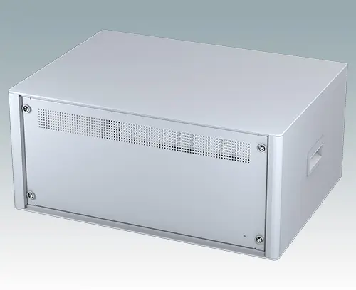 Das Gehäuse verfügt über eine Rückplatte, zwei ABS-Seitengriffe und vier ABS-Füße mit einsteckbare rutschfeste Gummifüße. Boden- und Rückplatte verfügen über Lüftungsschlitze. Interne Tragschienen für Baugruppenträger/Chassis.