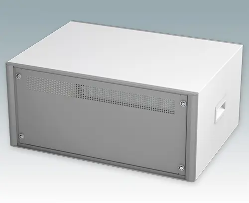 Das Gehäuse verfügt über eine Rückplatte, zwei ABS-Seitengriffe und vier ABS-Füße mit einsteckbare rutschfeste Gummifüße. Boden- und Rückplatte verfügen über Lüftungsschlitze. Interne Tragschienen für Baugruppenträger/Chassis.