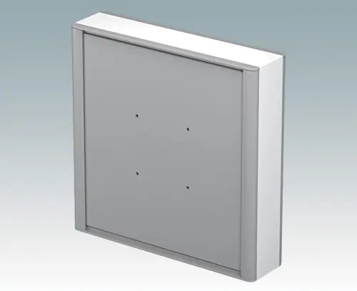 Modernes und äußerst attraktives Instrumentengehäuse aus Aluminium zur Aufnahme von Displays, Touchscreens und HMI-Elektronik. Auf der Rückseite sind VESA MIS-D 100-Befestigungspunkte vorhanden, um das Gerät an einem Standard VESA-Befestigungsarm oder einer Montagehalterung zu befestigen. Am Gehäusekörper aus Aluminium sind elegante Druckgussblenden vorne und hinten angebracht. Aufsteckbare Design-Blenden vorne und hinten verbergen alle Montageschrauben und sorgen für ein sehr professionelles Erscheinungsbild. Die Bodenplatte an der Unterseite bietet Platz für die Kabeleinführung. Im Inneren sind M3-Stehbolzen zur Leiterplattenmontage vorhanden. Die Montageprofile verfügen außerdem über M3-Gewinde und Führungsschienen zur Befestigung von Montageplatten. An allen Seiten sind M4-Erdungsbolzen angebracht; Einige Bolzen können auch mit Haltebändern verwendet werden, um die Vorder-/Rückwände während der Wartung zu halten. Frontplatten sind separat erhältlich. Zum Zubehör gehören ein Wandmontagesatz, eine Mastmontagehalterung und eine Montageplatte.