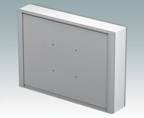 Modernes und äußerst attraktives Instrumentengehäuse aus Aluminium zur Aufnahme von Displays, Touchscreens und HMI-Elektronik. Auf der Rückseite sind VESA MIS-D 100-Befestigungspunkte vorhanden, um das Gerät an einem Standard VESA-Befestigungsarm oder einer Montagehalterung zu befestigen. Am Gehäusekörper aus Aluminium sind elegante Druckgussblenden vorne und hinten angebracht. Aufsteckbare Design-Blenden vorne und hinten verbergen alle Montageschrauben und sorgen für ein sehr professionelles Erscheinungsbild. Die Bodenplatte an der Unterseite bietet Platz für die Kabeleinführung. Im Inneren sind M3-Stehbolzen zur Leiterplattenmontage vorhanden. Die Montageprofile verfügen außerdem über M3-Gewinde und Führungsschienen zur Befestigung von Montageplatten. An allen Seiten sind M4-Erdungsbolzen angebracht; Einige Bolzen können auch mit Haltebändern verwendet werden, um die Vorder-/Rückwände während der Wartung zu halten. Frontplatten sind separat erhältlich. Zum Zubehör gehören ein Wandmontagesatz, eine Mastmontagehalterung und eine Montageplatte.