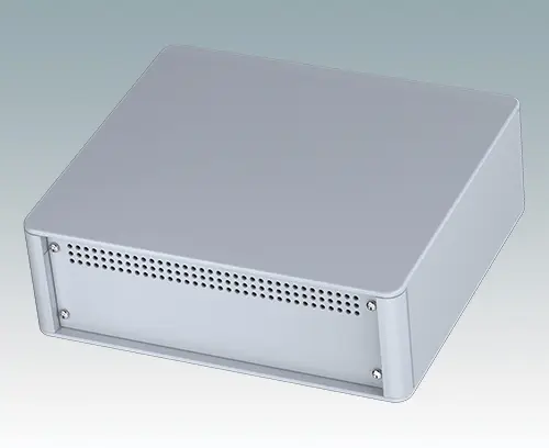 Das Gehäuse verfügt über eine Rückplatte und vier ABS-Kippfüße. Boden- und Rückplatte verfügen über Lüftungslöcher. Die Frontplatten sind gesondert zu bestellen.