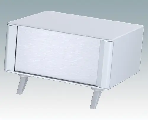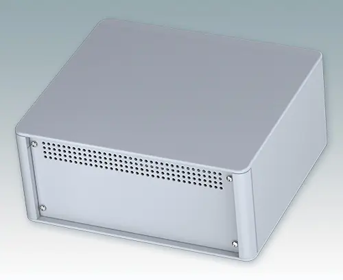 Das Gehäuse verfügt über eine Rückplatte und vier ABS-Kippfüße. Boden- und Rückplatte verfügen über Lüftungslöcher. Die Frontplatten sind gesondert zu bestellen.