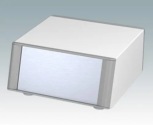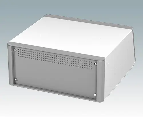 Moderne und äußerst attraktive Instrumentengehäuse mit geneigter Bedienfront für Tischanwendungen und Elektronik. Die eleganten Front- und Rückrahmen sind perfekt auf den Aluminiumgehäusekorpus abgestimmt. Design-Blenden (Front und Rückseite) verbergen die Montageschrauben sowie die Schrauben der Frontplatten und sorgen für eine professionelle Aufmachung. Das vormontierte interne Chassis verfügt über vier M3-Leiterplattenmontagebolzen im Boden. Das interne Chassis kann auch mit 5 Einschub-Leiterplatten ausgestattet werden dank der steckbaren Zubehör-Führung M6490020 (Bestellen Sie 2 Führungen pro Leiterplatte). Das Gehäuse verfügt über eine Rückplatte und vier ABS-Kippfüße. Boden- und Rückplatte verfügen über Lüftungslöcher. Die Frontplatten sind gesondert zu bestellen.