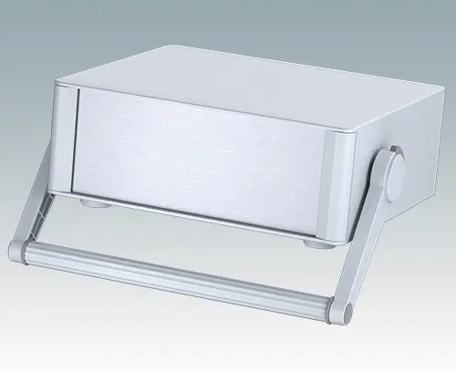 Modernes und äußerst attraktives Instrumentengehäuse mit Handgriff / Bügelhandgriff für Tischanwendungen und den mobilen Einsatz. Die eleganten Front- und Rückrahmen sind perfekt auf den Aluminiumgehäusekorpus abgestimmt. Design-Blenden (Front und Rückseite) verbergen die Montageschrauben sowie die Schrauben der Frontplatten und sorgen für eine professionelle Aufmachung. Der Tragegriff kann in 30°-Stufen angepasst werden. Das vormontierte interne Chassis verfügt über vier M3-Leiterplattenmontagebolzen in der Bodenplatte. Das interne Chassis kann auch mit 5 Einschub-Leiterplatten ausgestattet werden dank der steckbaren Zubehör-Führung M6490010 (Bestellen Sie 4 Führungen pro Leiterplatte).
