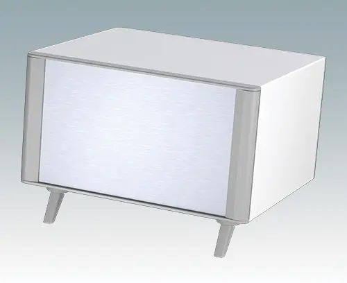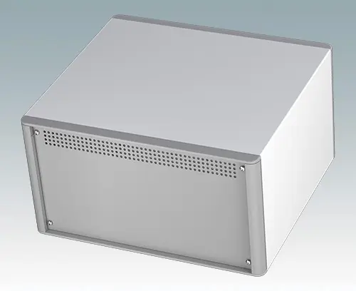 Das Gehäuse verfügt über eine Rückplatte und vier einstellbare ABS-Füße. Boden- und Rückplatte verfügen über Lüftungsschlitze. Die Frontplatten sind gesondert zu bestellen.
