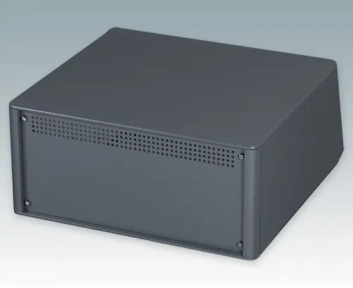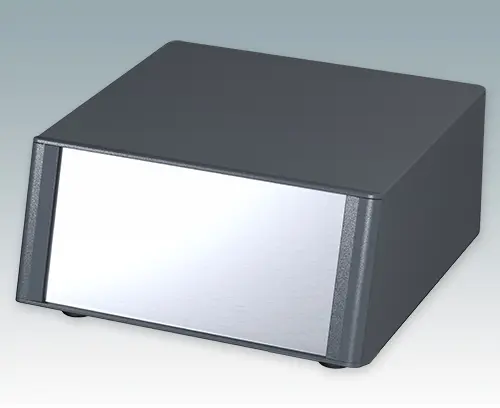 Moderne und äußerst attraktive Instrumentengehäuse mit geneigter Bedienfront für Tischanwendungen und Elektronik. Die eleganten Front- und Rückrahmen sind perfekt auf den Aluminiumgehäusekorpus abgestimmt. Design-Blenden (Front und Rückseite) verbergen die Montageschrauben sowie die Schrauben der Frontplatten und sorgen für eine professionelle Aufmachung. Das vormontierte interne Chassis verfügt über vier M3-Leiterplattenmontagebolzen im Boden. Das interne Chassis kann auch mit 7 Einschub-Leiterplatten ausgestattet werden dank der steckbaren M6490010 (Bestellen Sie 4 Führungen pro Leiterplatte). Das Gehäuse verfügt über eine Rückplatte und vier ABS-Kippfüße. Boden- und Rückplatte verfügen über Lüftungslöcher. Die Frontplatten sind gesondert zu bestellen.