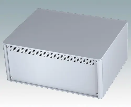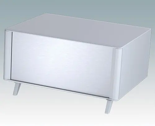 Das Gehäuse verfügt über eine Rückplatte und vier einstellbare ABS-Füße. Boden- und Rückplatte verfügen über Lüftungsschlitze. Die Frontplatten sind gesondert zu bestellen.