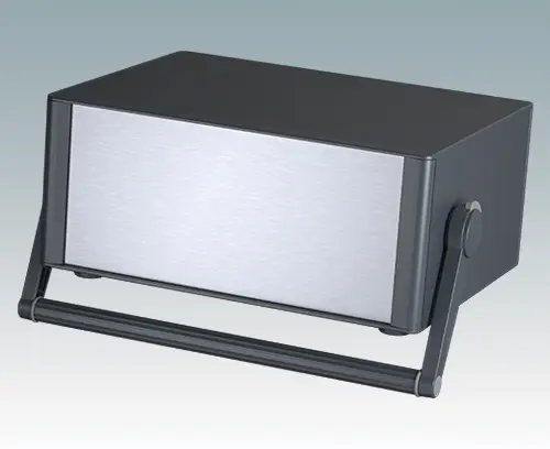 Modernes und äußerst attraktives Instrumentengehäuse mit Handgriff / Bügelhandgriff für Tischanwendungen und den mobilen Einsatz. Die eleganten Front- und Rückrahmen sind perfekt auf den Aluminiumgehäusekorpus abgestimmt. Design-Blenden (Front und Rückseite) verbergen die Montageschrauben sowie die Schrauben der Frontplatten und sorgen für eine professionelle Aufmachung. Der Tragegriff kann in 30°-Stufen angepasst werden. Das vormontierte interne Chassis verfügt über vier M3-Leiterplattenmontagebolzen in der Bodenplatte. Das interne Chassis kann auch mit 9 Einschub-Leiterplatten ausgestattet werden dank der steckbaren Zubehör-Führung M6490010 (Bestellen Sie 4 Führungen pro Leiterplatte).