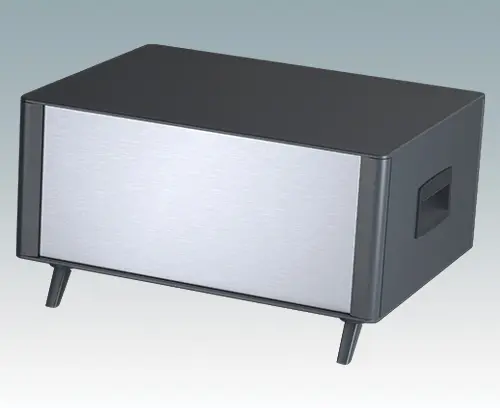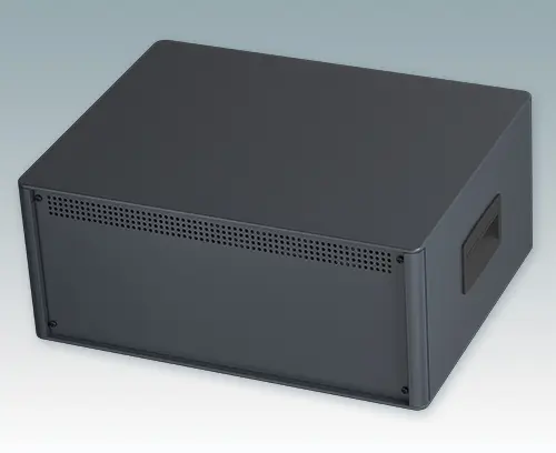 Das Gehäuse verfügt über eine Rückplatte, zwei ABS-Seitengriffe und vier einstellbare ABS-Füße. Boden- und Rückplatte verfügen über Lüftungsschlitze. Die Frontplatten sind gesondert zu bestellen.
