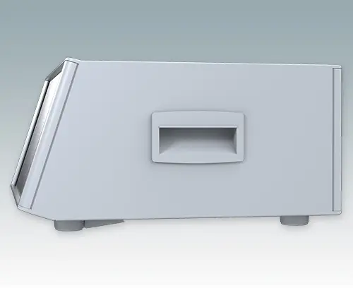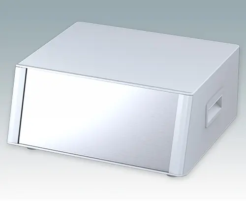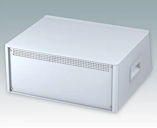Modernes und äußerst attraktives Instrumentengehäuse mit geneigter Bedienfront für Tischanwendungen und den mobilen Einsatz. Die eleganten Front- und Rückrahmen sind perfekt auf den Aluminiumgehäusekorpus abgestimmt. Design-Blenden (Front und Rückseite) verbergen die Montageschrauben sowie die Schrauben der Frontplatten und sorgen für eine professionelle Aufmachung. Das vormontierte interne Chassis verfügt über vier M3-Leiterplattenmontagebolzen im Boden. Das interne Chassis kann auch mit 9 Einschub-Leiterplatten ausgestattet werden dank der steckbaren Zubehör-Führung M6490010 (Bestellen Sie 4 Führungen pro Leiterplatte). Das Gehäuse verfügt über eine Rückplatte, zwei ABS-Seitengriffe und vier einstellbare ABS-Füße. Boden- und Rückplatte verfügen über Lüftungsschlitze. Die Frontplatten sind gesondert zu bestellen.