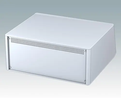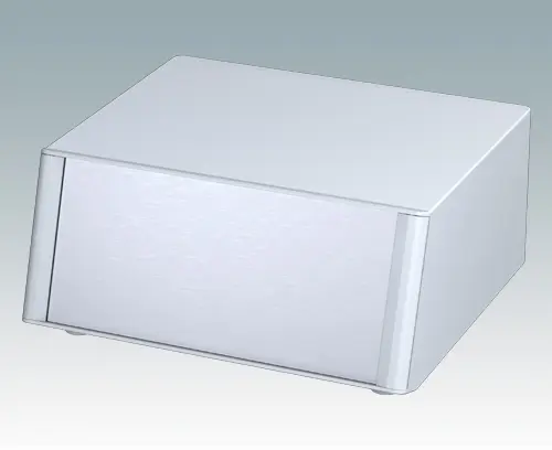 Modernes und äußerst attraktives Instrumentengehäuse mit abfallender Frontblende für Tischanwendungen und den mobilen Einsatz. Die eleganten Front- und Rückrahmen sind perfekt auf den Aluminiumgehäusekorpus abgestimmt. Design-Blenden (Front und Rückseite) verbergen die Montageschrauben sowie die Schrauben der Frontplatten und sorgen für eine professionelle Aufmachung. Das vormontierte interne Chassis verfügt über vier M3-Leiterplattenmontagebolzen im Boden. Das interne Chassis kann auch mit 9 Einschub-Leiterplatten ausgestattet werden dank der steckbaren Zubehör-Führung M6490010 (Bestellen Sie 4 Führungen pro Leiterplatte). Das Gehäuse verfügt über eine Rückplatte und vier einstellbare ABS-Füße. Boden- und Rückplatte verfügen über Lüftungsschlitze. Die Frontplatten sind gesondert zu bestellen.