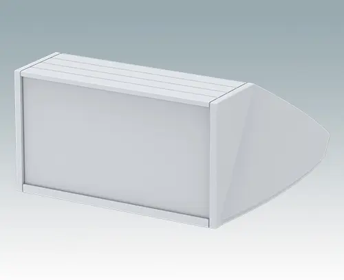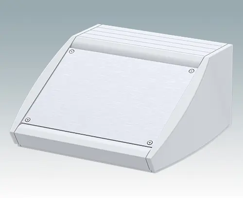 Pultgehäuse mit ergonomisch günstiger Bedienfront und Schutzart IP 54 für Tisch- oder Wandanwendungen. Vormontiertes Aluminium-Gehäuse mit abnehmbarer Bodenplatte. Für die Schutzart IP 54 ist es erforderlich, die Öffnungen der Bodenplatte mit dem Leiterkarten-Montage-Set M 56 00 001 oder eigenen Leiterkartenbefestigungen zu verschließen. Frontplatte als Zubehör.