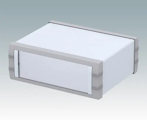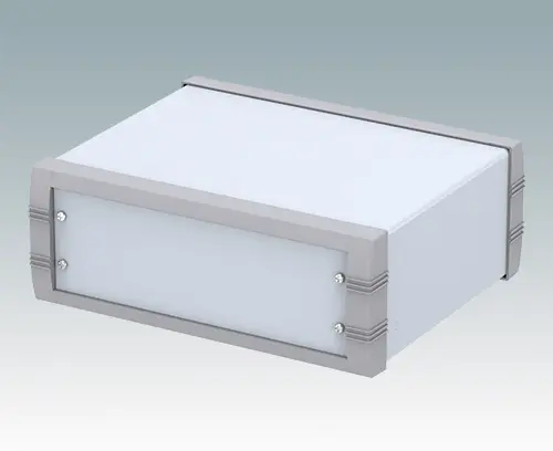 Modernes Aluminiumgehäuse für Tischanwendungen. Vormontiertes Innenchassis mit vier Rastführungen für Leiterplatinen. Vier Standardführungspositionen – zusätzliche Positionen können auf Anfrage ausgestanzt werden. Elegante Front- und Rückrahmen passend zum vorgefertigten Gehäuseaufbau. Eine abnehmbare Rückplatte und vier selbstklebende rutschhemmende Füße sind inklusive. Frontplatten-Set als Zubehör.