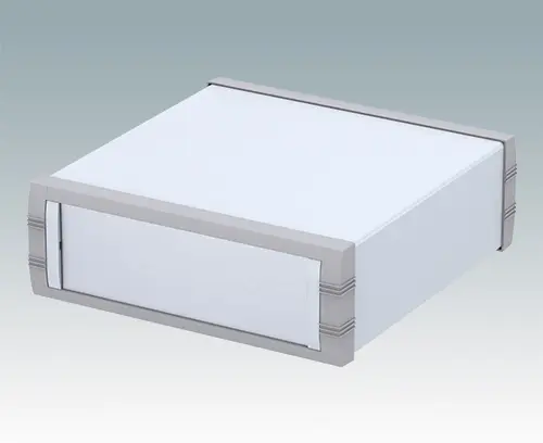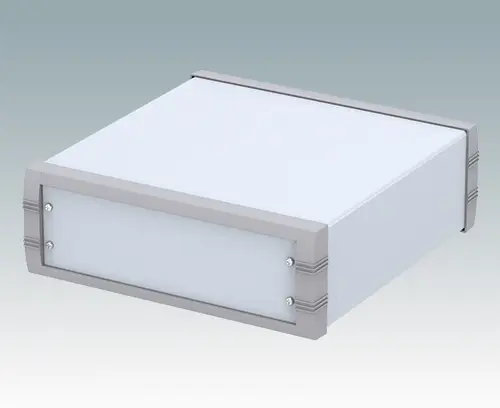 Modernes Aluminiumgehäuse für Tischanwendungen. Vormontiertes Innenchassis mit vier Rastführungen für Leiterplatinen. Vier Standardführungspositionen – zusätzliche Positionen können auf Anfrage ausgestanzt werden. Elegante Front- und Rückrahmen passend zum vorgefertigten Gehäuseaufbau. Eine abnehmbare Rückplatte und vier selbstklebende rutschhemmende Füße sind inklusive. Frontplatten-Set als Zubehör.