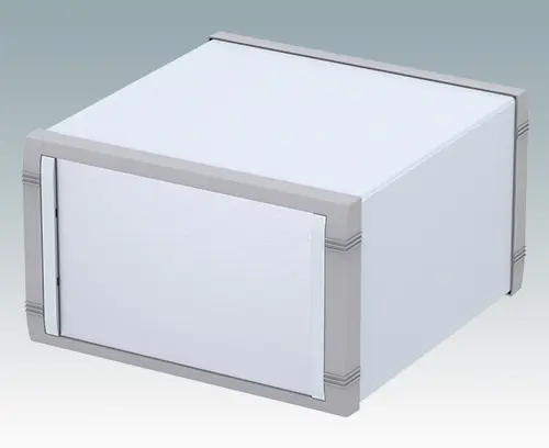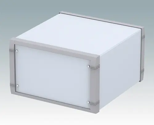 Modernes Aluminiumgehäuse für Tischanwendungen. Vormontiertes Innenchassis mit vier Rastführungen für Leiterplatinen. Vier Standardführungspositionen – zusätzliche Positionen können auf Anfrage ausgestanzt werden. Elegante Front- und Rückrahmen passend zum vorgefertigten Gehäuseaufbau. Eine abnehmbare Rückplatte und vier selbstklebende rutschhemmende Füße sind inklusive. Frontplatten-Set als Zubehör.