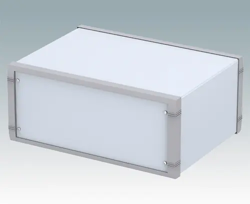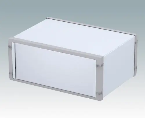 Modernes Aluminiumgehäuse für Tischanwendungen. Vormontiertes Innenchassis mit vier Rastführungen für Leiterplatinen. Vier Standardführungspositionen – zusätzliche Positionen können auf Anfrage ausgestanzt werden. Elegante Front- und Rückrahmen passend zum vorgefertigten Gehäuseaufbau. Eine abnehmbare Rückplatte und vier selbstklebende rutschhemmende Füße sind inklusive. Frontplatten-Set als Zubehör.