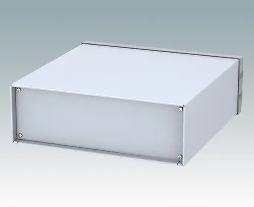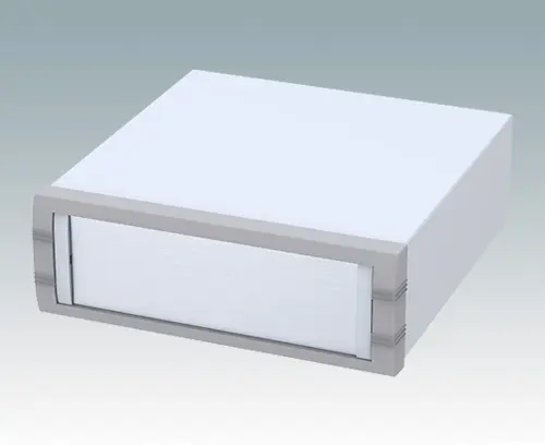 Modernes Instrumentengehäuse für Tischanwendungen oder mobilen Einsatz. Oberteil gekantet aus Aluminium mit Druckguss-Frontrahmen. Boden- und Rückplatten sind abnehmbar. Frontplatten-Set als Zubehör.