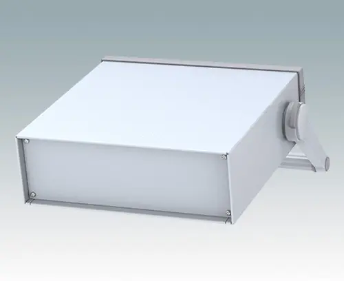 Modernes Instrumentengehäuse für Tischanwendungen oder mobilen Einsatz. Mit Griffbügel. Oberteil gekantet aus Aluminium mit Druckguss-Frontrahmen. Boden- und Rückplatten sind abnehmbar. Frontplatten-Set als Zubehör.