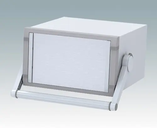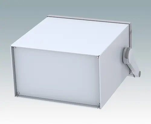 Modernes Instrumentengehäuse für Tischanwendungen oder mobilen Einsatz. Mit Griffbügel. Oberteil gekantet aus Aluminium mit Druckguss-Frontrahmen. Boden- und Rückplatten sind abnehmbar. Frontplatten-Set als Zubehör.