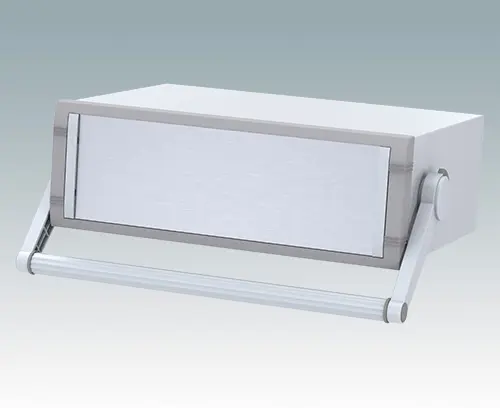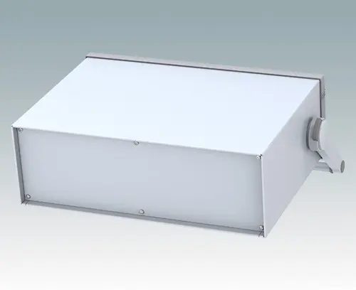 Modernes Instrumentengehäuse für Tischanwendungen oder mobilen Einsatz. Mit Griffbügel. Oberteil gekantet aus Aluminium mit Druckguss-Frontrahmen. Boden- und Rückplatten sind abnehmbar. Frontplatten-Set als Zubehör.
