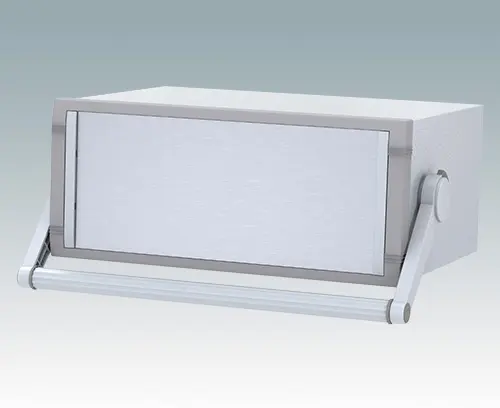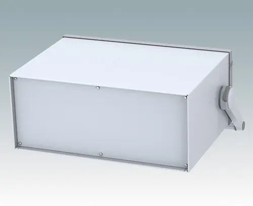 Modernes Instrumentengehäuse für Tischanwendungen oder mobilen Einsatz. Mit Griffbügel. Oberteil gekantet aus Aluminium mit Druckguss-Frontrahmen. Boden- und Rückplatten sind abnehmbar. Frontplatten-Set als Zubehör.