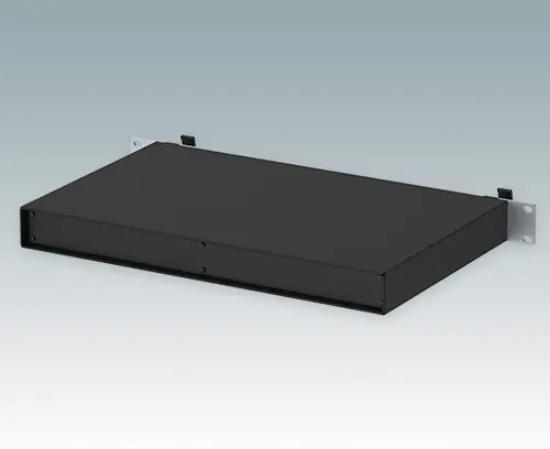 Modern und vielseitig einsetzbare 19" Rack-Gehäuse mit eloxierter Aluminium Frontplatte und integrierten 'Komfortgriffen'. Gehäuse aus Aluminium, gekantet. Alle Befestigungen auf der Unterseite. Abnehmbare Boden- und Rückplatte für guten Zugang